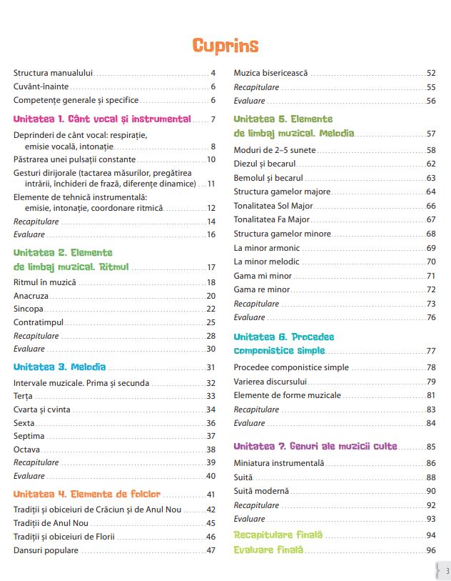 Manualul de Educattie muzicala este structurat pe unitaati tematice, care dezvolta continuturile din programa. Prezentate intr-o forma deosebit de atractiva, lectiile cuprind exemple de activitati care conduc la formarea de competentte specifice disciplinei. Manualul cuprinde numeroase exercitii, intrebari si propuneri de proiecte care au potentialul de a capta atentia si de a stimula curiozitatea si interesul elevilor.