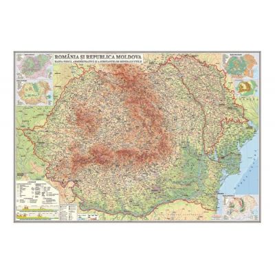 Romania si Republica Moldova. Harta, fizica, administrativa si a substantelor minerale utile /Harta de contur (verso), 600x470mm, fara sipci (GHRF60)