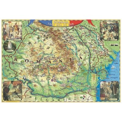 Harta interactiva cu recunoastere vizuala Romania - tara mea de dor cuprinde cele mai reprezentative monumente culturale din Romania vazute din perspectiva 3D. Acestea includ obiectivele din patrimoniul UNESCO precum si un sir de alte obiective culturale ce reflecta evenimentele-cheie din istoria culturii si civilizatiei romanesti monumentul triumfal de la Adamclisi mauzoleul de la Marasesti complexul monumental de la Tg. Jiu Arcul de Triumf din Bucuresti etc. Totodata harta cuprinde si obiective culturale reprezentative pentru spatiul romanesc din afara granitelor tarii precum cetatea Soroca biserica-monument de la Causeni R. Moldova propusa pentru a fi inclusa in patrimoniul UNESCO Universitatea din Cernauti fostul Palat Mitropolitan Cetatea Alba etc. Interactivitatea hartii este asigurata de programul MapScanner by Eurodidactica de pe GooglePlay sau AppStore ce permite fiecarui utilizator - prin scanarea imaginii cu telefonul mobil - accesul la o scurta descriere a obiectivului vizat. Caracteristici tehnice silk dublu laminat cu folie 25 microni harta fara sipci. Dimensiune 1000x700mm.Specificatii