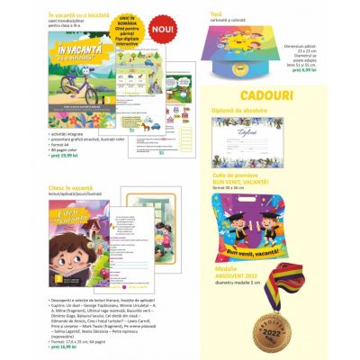 Pachetul de premiere este special conceput pentru a-i recompensa pe elevi la final de an scolar si a sprijini exersarea pe durata vacantei de vara. Este compus din In vacanta cu o bicicleta - caiet transdisciplinar cu jocuri exercitii si aplicatii format A4 80 pagini Citesc in vacanta - lecturi aplicatii jocuri ilustratii format B5 64 pagini Diploma de absolvire cu model floral Medalie cu mesajul Absolvent 2022 Toca multicolora Cutie cartonata cu mesajul Bun venit vacantaSpecificatii