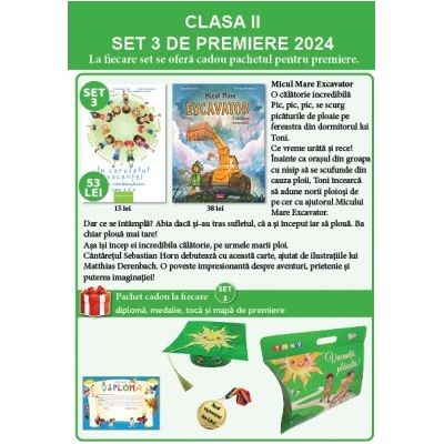 Setul contine 1. In caruselul vacantei -Fise interdisciplinare clasa a II-a - Lecturi atractive si accesibile exercitii captivante glume jocuri si curiozitati. Avizat MEN. 2. Micul Mare Excavator - O calatorie incredibila - Pic pic pic se scurg picaturile de ploaie pe fereastra din dormitorul lui Toni. Ce vreme urata si rece Inainte ca orasul din groapa cu nisip sa se scufunde din cauza ploii Toni incearca sa adune norii ploioii de pe cer cu ajutorul Micului Mare Excavator. Dar ce se intampla Abia daca si-au tras sufletul ca a si inceput iar sa ploua. Ba chiar ploua mai tare Asa isi incep ei incredibila calatorie pe urmele marii ploi. Cantaretul Sebastian Horn debuteaza cu aceasta carte ajutat de ilustratiile lui Matthias Derenbach. O poveste impresionanta despre aventuri prietenie si puterea imaginatiei La fiecare set se ofera CADOU pachetul pentru premiere diploma medalie toca si mapa de premiere.Specificatii