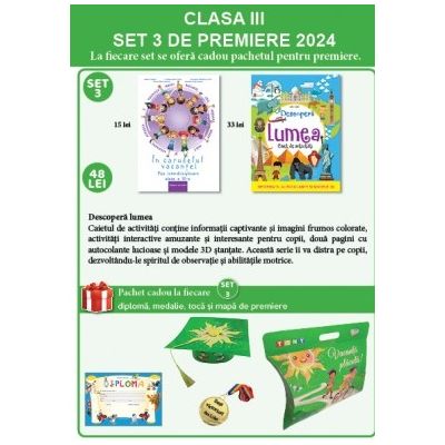 Setul contine 1. In caruselul vacantei -Fise interdisciplinare clasa a III-a - Lecturi atractive si accesibile exercitii captivante glume jocuri si curiozitati. Avizat MEN. 2. Descopera lumea - Caiet de activitati - Contine informatii captivante si imagini frumos colorate activitati interactive amuzante si interesante pentru copii doua pagini cu autocolante lucioase si modele 3D stantate. Aceasta serie ii va distra pe copii dezvoltandu-le spiritul de observatie si abilitatile motrice. La fiecare set se ofera CADOU pachetul pentru premiere diploma medalie toca si mapa de premiere.Specificatii
