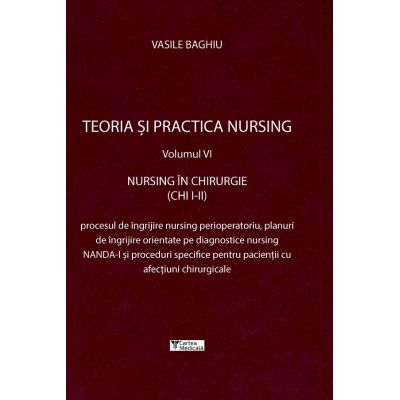 Acest ghid didactic este parte a proiectului mai larg Teoria si practica nursing si apare in continuarea volumelor Planuri de ingrijire asociate diagnosticelor nursing NANDA-I vol. I Viata Medicala Romaneasca 2017 Planuri de ingrijire asociate diagnosticelor clinice vol. II Cartea Medicala 2018 Procesul de ingrijire a pacientului Nursing General I vol. III Cartea Medicala 2019 Tehnici nursing si administrarea medicamentelor Nursing General II vol. IV Cartea Medicala 2020 Nursing in medicina interna MI I-II vol. V Cartea Medicala 2020 . Cartea prezinta in acord cu cea mai recenta programa din invatamantul sanitar procesul de ingrijire perioperatoriu si planuri de ingrijire pentru pacientii cu afectiuni chirurgicale cu diagnosticele nursing NANDA-I specifice si tehnici si investigatii de baza cu un capitol introductiv despre procesul de ingrijire general si un conform standardelor internationale. Elevii studentii si profesorii din domeniu vor gasi aici un instrument de lucru foarte util corespunzator modulului Chirurgie si nursing specific CHI I-II iar asistentii medicali isi pot verifica abordari si practici din experienta lor la patul bolnavului.Specificatii
