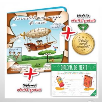 Click pe poza alaturata pentru a vizualiza continutul Pachetul contine 1. Jurnalul meu magic de vara clasa pregatitoare 2. Medalie pentru merite deosebite 3. Diploma de merit Povestea continua... ... dupa ce vacanta de iarna a fost petrecuta in compania fascinanta a unui prieten magic Jurnalul de iarna este timpul sa le daruim copiilor un Jurnal la fel de magic pentru vacanta de vara. Asa cum deja i-am obisnuit pe micii nostri prieteni le oferim un ghid prietenos de vacanta care sa raspunda intereselor lor sa le incite curiozitatea sa ii determine sa fie creativi imaginativi sa ii incurajeze sa comunice relaxati cu cei din jurul lor. Jurnalul meu magic de vara Este un material interactiv copilul lucreaza creeaza comunica se joaca... Contribuie la dezvoltarea abilitatilor practice si a acuitatii vizuale prin confectionarea de obiecte din materiale reciclabile realizarea de tablouri Origami capacitatii de a comunica si lucra in echipa prin realizarea unor proiecte impreuna cu un adult cum ar fi prepararea unor produse culinare dupa retete simple si amuzante . Editura Delfin pune la dispozitia cadrelor didactice LA CERERE cate O DIPLOMA pentru fiecare Jurnal comandat pe care sa o ofere elevului pentru rezultatele obtinute de-a lungul intregului an scolar In curand Editura Delfin va asteapta cu noi surprize auxiliare interactive creative si complete Comunicare in limba romana Matematica si explorarea mediului clasa pregatitoare clasa I si clasa a II-a Limba si literatura romana Matematica clasa a III-a si clasa a IV-a si alte discipline. 10 motive pentru care sa ai lucrarile magice Introducerea in atmosfera magica se face intr-o maniera jucausa si prietenoasa un cuvant inainte in... rime Cel mic descopera cateva tari ale planetei sau calatoreste pe toate continentele intr-un ocol al lumii ca un adevarat Jules Verne Fii si tu parinte Jocuri de rol cu tematica atractiva - dezvoltarea spiritului de echipa spiritului de competitie determinarea membrilor familiei sa colaboreze sa comunice si sa isi asume anumite responsabilitati. Jocurile copilariei in aer liber Colectionarea diferitelor materiale adunate din vacanta exemplu un bilet de tren un bilet de la un spectacol de teatru concert... Vizarea competentelor dobandite de elevi pe parcursul intregului an scolar Activitati gandite in maniera integrata Carticica magica poate fi decupata clasa pregatitoare - carticica de colorat atractiva clasa I si clasa a II-a - Stiati ca... -uri curiozitati si imagini de colorat clasa a III-a si clasa a IV-a - album de cercetator. Cartea postala - poate fi decupata si expediata Doamnei Invatatoare Material interactiv care il ajuta pe copil sa fie creativ inventiv si capabil de comunicare reala cu cei din jur. Cei mici invata spre exemplu sa-si organizeze timpul invata despre diferentele de fus-orar calatorind in alte tari sau pe alte continente despre obiceiurile culinare ale altor popoare gatind impreuna cu familia descopera animale pasari din diferite zone ale lumii toate acestea satisfacand nevoia copiilor de a cerceta de a descoperi de a explora lucruri locuri noi si intamplari din orizontul lor de interes. Singurele lucrari de pe piata care ii implica in mod real atat pe copii cat si pe parinti in activitati comune interesante instructive si relaxante. Copilas dragalas E vara Un nou jurnal asteapta sa-ti dezvaluie secretele lui. Te va insoti in calatoriile acestei veri si te va mentine in forma. Accepta compania lui plina de provocari si cele invatate in timpul scolii te vor ajuta sa le faci fata Cerceteaza informeaza-te si realizeaza primul tau Album de cercetator Dragi parinti de copilasi dragalasi Va sta bine cand sunteti curiosi cand sunteti jucausi cand va lasati purtati din nou in lumea magica a copilariei Indrazniti Alaturati-va copiilor vostri si descoperiti impreuna secretele acestui jurnal