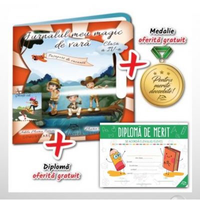 Click pe poza alaturata pentru a vizualiza continutul Pachetul contine 1. Jurnalul meu magic de vara clasa pregatitoare 2. Medalie pentru merite deosebite 3. Diploma de merit Povestea continua... ... dupa ce vacanta de iarna a fost petrecuta in compania fascinanta a unui prieten magic Jurnalul de iarna este timpul sa le daruim copiilor un Jurnal la fel de magic pentru vacanta de vara. Asa cum deja i-am obisnuit pe micii nostri prieteni le oferim un ghid prietenos de vacanta care sa raspunda intereselor lor sa le incite curiozitatea sa ii determine sa fie creativi imaginativi sa ii incurajeze sa comunice relaxati cu cei din jurul lor. Jurnalul meu magic de vara Este un material interactiv copilul lucreaza creeaza comunica se joaca... Contribuie la dezvoltarea abilitatilor practice si a acuitatii vizuale prin confectionarea de obiecte din materiale reciclabile realizarea de tablouri Origami capacitatii de a comunica si lucra in echipa prin realizarea unor proiecte impreuna cu un adult cum ar fi prepararea unor produse culinare dupa retete simple si amuzante . Editura Delfin pune la dispozitia cadrelor didactice LA CERERE cate O DIPLOMA pentru fiecare Jurnal comandat pe care sa o ofere elevului pentru rezultatele obtinute de-a lungul intregului an scolar In curand Editura Delfin va asteapta cu noi surprize auxiliare interactive creative si complete Comunicare in limba romana Matematica si explorarea mediului clasa pregatitoare clasa I si clasa a II-a Limba si literatura romana Matematica clasa a III-a si clasa a IV-a si alte discipline. 10 motive pentru care sa ai lucrarile magice Introducerea in atmosfera magica se face intr-o maniera jucausa si prietenoasa un cuvant inainte in... rime Cel mic descopera cateva tari ale planetei sau calatoreste pe toate continentele intr-un ocol al lumii ca un adevarat Jules Verne Fii si tu parinte Jocuri de rol cu tematica atractiva - dezvoltarea spiritului de echipa spiritului de competitie determinarea membrilor familiei sa colaboreze sa comunice si sa isi asume anumite responsabilitati. Jocurile copilariei in aer liber Colectionarea diferitelor materiale adunate din vacanta exemplu un bilet de tren un bilet de la un spectacol de teatru concert... Vizarea competentelor dobandite de elevi pe parcursul intregului an scolar Activitati gandite in maniera integrata Carticica magica poate fi decupata clasa pregatitoare - carticica de colorat atractiva clasa I si clasa a II-a - Stiati ca... -uri curiozitati si imagini de colorat clasa a III-a si clasa a IV-a - album de cercetator. Cartea postala - poate fi decupata si expediata Doamnei Invatatoare Material interactiv care il ajuta pe copil sa fie creativ inventiv si capabil de comunicare reala cu cei din jur. Cei mici invata spre exemplu sa-si organizeze timpul invata despre diferentele de fus-orar calatorind in alte tari sau pe alte continente despre obiceiurile culinare ale altor popoare gatind impreuna cu familia descopera animale pasari din diferite zone ale lumii toate acestea satisfacand nevoia copiilor de a cerceta de a descoperi de a explora lucruri locuri noi si intamplari din orizontul lor de interes. Singurele lucrari de pe piata care ii implica in mod real atat pe copii cat si pe parinti in activitati comune interesante instructive si relaxante. Copilas dragalas E vara Un nou jurnal asteapta sa-ti dezvaluie secretele lui. Te va insoti in calatoriile acestei veri si te va mentine in forma. Accepta compania lui plina de provocari si cele invatate in timpul scolii te vor ajuta sa le faci fata Cerceteaza informeaza-te si realizeaza primul tau Album de cercetator Dragi parinti de copilasi dragalasi Va sta bine cand sunteti curiosi cand sunteti jucausi cand va lasati purtati din nou in lumea magica a copilariei Indrazniti Alaturati-va copiilor vostri si descoperiti impreuna secretele acestui jurnal