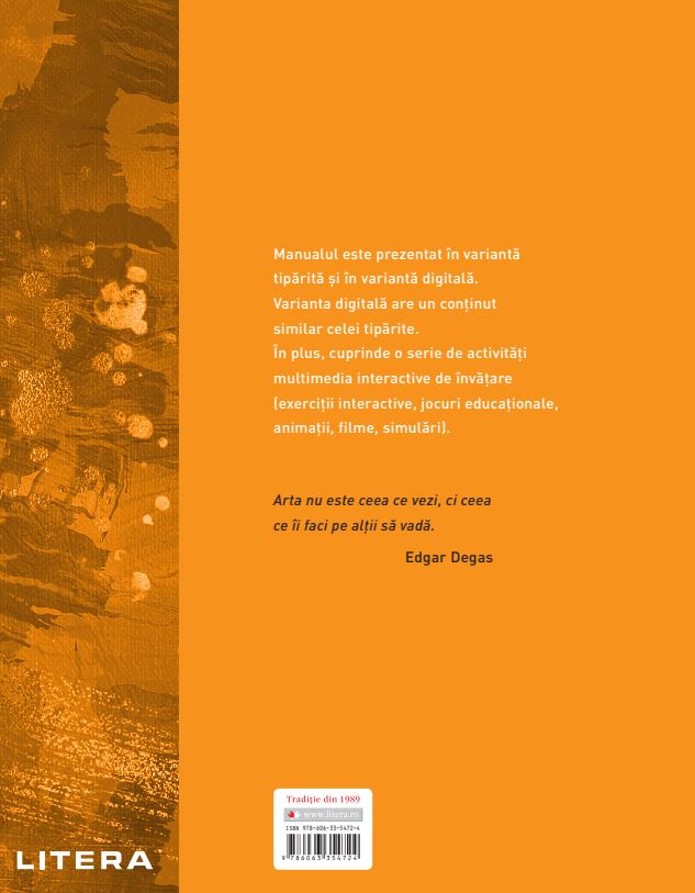 Manual aprobat MEC 2020 Manualul Educatie Plastica pentru clasa a 8‑a cuprinde sase unitati de invatare care respecta modelul de proiectare centrat pe construirea de competente si continuturile din programa. Lectiile sunt insotite de activitati de invatare-evaluare interactive, cu caracter practic-aplicativ, care determina formarea competentelor specifice cu care acestea sunt corelate. Constructia permite crearea de punti de legatura cu celelalte discipline studiate in clasa a 8-a, respectiv cu Istoria, Limba si literatura romana, Consilierea si Dezvoltarea personala, Anatomia, Matematica etc. Faciliteaza momente valoroase de reflectie despre arta si felurile in care privim lumea. Ce anume determina ca un anumit lucru sa fie numit arta? Ce este un artist? As putea eu sa fiu artist? Ce rol are arta? In ce fel ma poate ajuta pe mine? Ce legatura are arta cu viata mea? Poate arta sa schimbe ceva? Acestea sunt doar cateva dintre intrebarile in jurul carora elevii pot explora.Specificatii