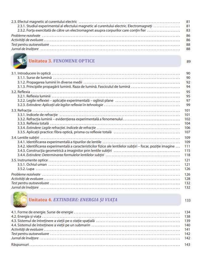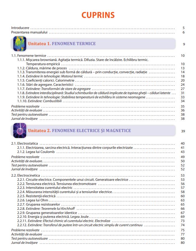 Manualul Fizica pentru clasa a VIII‑a cuprinde patru unitati de invatare care respecta modelul de proiectare centrat pe construirea de competente si continuturile din programa. Lectiile sunt insotite de activitati de invatare-evaluare interactive, cu caracter practic-aplicativ, care determina formarea competentelor specifice cu care acestea sunt corelate.