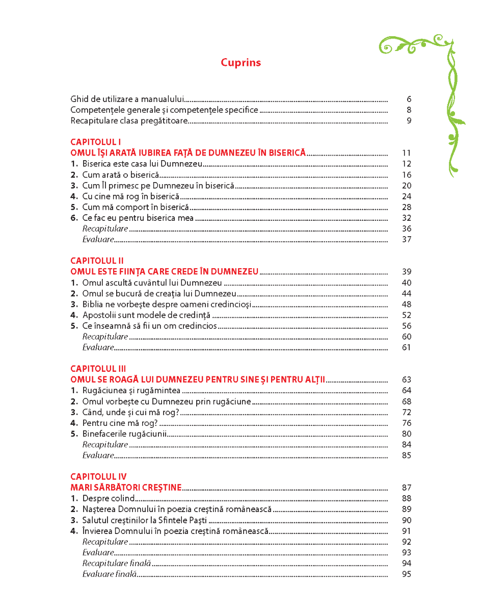 Organizat intr-un mod structurat progresiv, sprijinind invatarea elevilor de varsta 7-8 ani intr-un mod logic si coerent, manualul respecta domeniile de continut conform programei. De asemenea, manualul propune modalitati de organizare curriculara de tip inter-disciplinar, coreland continuturile la nivelul mai multor discipline sau domenii de studiu: citire si scriere (clasa I), muzica si pictura, lucru manual, stiinte. Manualul propune o modalitate de organizare de la aspecte concrete, legate de viata de zi cu zi a elevilor, pana la generalizari si concepte mai abstracte, privind viata religioasa si specificul cultului ortodox.