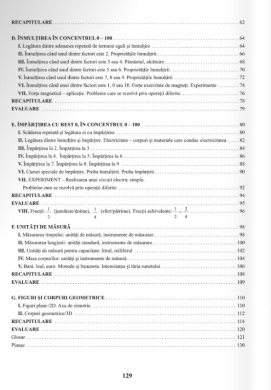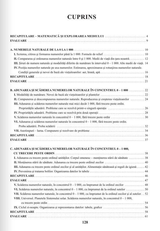Pe langa exercitii de matematica adaptate curriculei, sunt inserate intre acestea exercitii cu ajutorul carora elevii vor identifica si numi vietati si fenomene ale naturii, vor acumula cunostinte despre anotimpuri, aspecte ce tin de diferite zone ale planetei si animale care traiesc in aceste zone, vor lucra in echipa, vor invata comportamente ce tin de condiuta potrivita pentru conservarea naturii, igiena, sanatate, vitamine si multe altele. Manualul de matematica clasa 2 Editura didactica si pedagogica cuprinde si operatii cu sute, zeci si unitati, adunari si scaderi cu numere mari, odonari, inmultiri, impartiri, elemente simple de geometrie, unitati de masura.