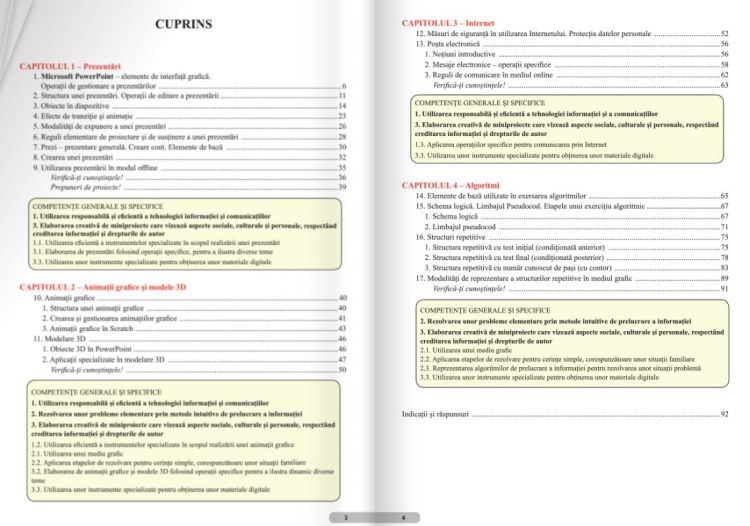 Cuprins Capitolul 1 - Prezentari Capitolul 2 - Animatii grafice si modele 3D Capitolul 3 - Internet Capitolul 4 - Algoritmi Indicatii si raspunsuriSpecificatii