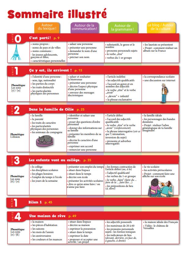 Continuturile prezentului manual, semnalate atragator in « Sommaire illustré », abordeaza efectiv tematica recomandata de Programa scolara: copilul despre sine: insusiri si stari sufletesti, partile corpului, starea sanatatii, copilul si universul sau, familia si relatiile de rudenie, profesii, locuinta, mobilierul, obiectele electrocasnice, scoala, orarul, localitatea, aspecte din viata cotidiana, vremea si clima, momentele zilei, exprimarea orei / datei, activitati de timp liber, convorbiri telefonice, elemente de cultura si civilizatie franceza / francofona – nume de persoane, denumiri geografice (in toate unitatile: 0 - „C’es parti!”, 1 - „Ça y est, ils arrivent!”, 2 - „Dans la famille de Célie”, 3 - „Les enfants vont au collège, 4 - „Une maison de rêve”, 5 – „ Je communique avec mes copains”, 6 – „Un tour dans la capitale”, 7 – „La ville est à nous”, 8 – „Au revoir les amis!”).