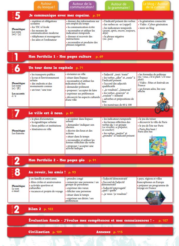 Fiecare unitate este logic structurata in vederea achizitionarii si consolidarii de cuvinte noi pentru o imbogatire constanta si progresiva a vocabularului limbii franceze, in stransa legatura cu tematica propusa ; in acelasi spirit, elemente de gramatica functionala (acte de vorbire / functii ale limbii / conventii socio-culturale / elemente de constructie a comunicarii), prevazute de Programa scolara, se regasesc in cadrul fiecarei unitati de invatare, la fel ca si diferitele elemente gramaticale (in limitele prevazute in Programa Scolara a disciplinei, pentru clasa a VI a, L2) necesare comunicarii autentice in limba franceza, atat verbal cat si in scris.
