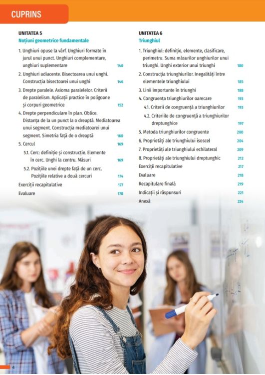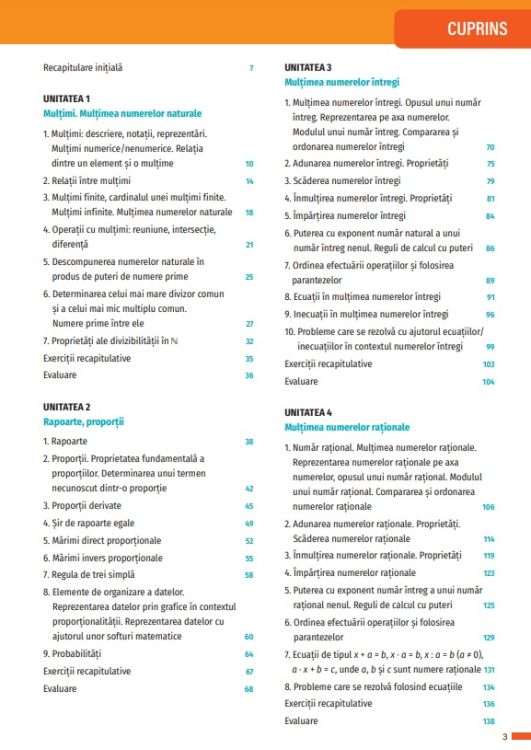 Manualul de Matematica pentru clasa a VI-a este realizat in conformitate cu Programa scolara aprobata prin OM nr. 3393 28. 02. 2017. Manualul este structurat in 6 unitati de invatare Unitatea 1 Multimi. Multimea numerelor naturale Unitatea 2 Rapoarte proportii Unitatea 3 Multimea numerelor intregi Unitatea 4 Multimea numerelor rationale Unitatea 5 Notiuni geometrice fundamentale Unitatea 6 Triunghiul. Acestea respecta integral domeniile de continut ale programei scolare fiecare unitate incluzand cate o secventa recapitulativa si o evaluare. Construit in baza noilor repere pe care se structureaza curriculumul scolar aplicat in prezent in invatamantul gimnazial manualul de Matematica pentru clasa a VI-a are la baza un demers pedagogic structurat coerent si progresiv bazat pe observare descoperire organizare interiorizare sistematizare si evaluare. Manualul se numara printre castigatoarele licitatiei organizate de Ministerul Educatiei cu nota 97 60.Specificatii