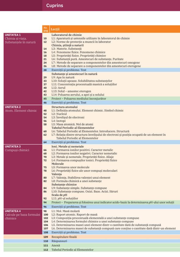 Incursiunea in lumea chimiei se face parcurgand 4 unitati de invatare: