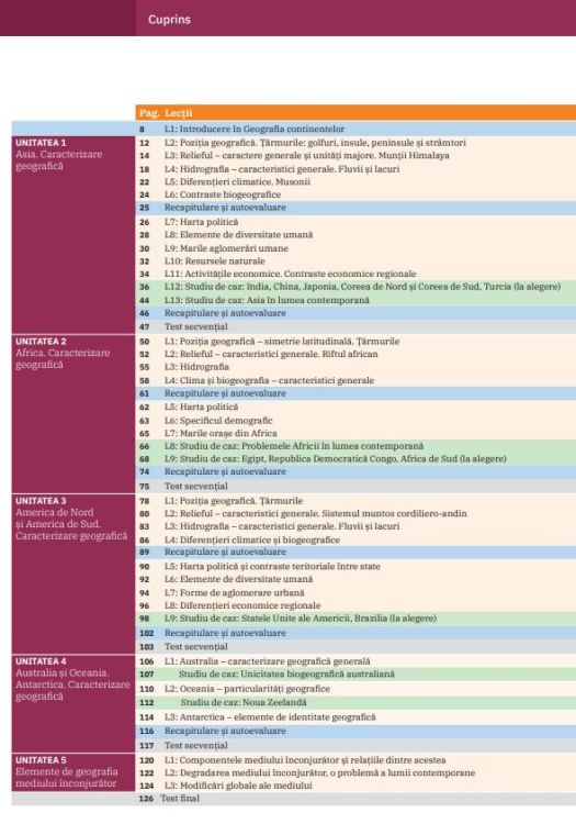Geografie. Manual pentru clasa a 7-a - Silviu Negut Carmen Camelia Radulescu Ionut Popa Pornind de la cunostintele dobandite in anii anteriori de studiu la Geografie dar si la alte discipline precum Istorie Matematica Fizica Biologie sau Stiinte ale naturii fiecare lectie debuteaza cu o secventa de actualizare prin care se discuta se actualizeaza si se valorifica notiuni deja cunoscute demersul este necesar pentru stimularea interesului elevilor in vederea abordarii noilor continuturi. Integrand tehnici si mijloace moderne de invatare evaluare manualul ofera posibilitatea asimilarii cunostintelor atat in maniera clasica prin intermediul auxiliarelor de tip harta atlas sau caiet cat si prin intermediul mijloacelor multimedia actuale in pas cu tehnologia digitala prin trimiteri catre pagini web unde pot fi intelese diferite tipuri de fenomene si realitati geografice. In abordarea temelor de geografie a continentelor si de geografie a mediului inconjurator lucrarea prezinta pentru fiecare tema legatura acestora cu realitatea cotidiana si acolo unde este cazul prezinta contributiile romanesti la cunoasterea regiunii sau fenomenului respectiv. In acest fel i se ofera elevului sansa de a conecta experienta personala imediata din orizontul apropiat si local cu mecanismele generale ale realitatii geografice globale.Specificatii