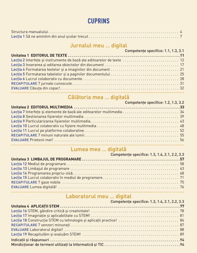 Manualul propune o calatorie in ”Lumea digitala” in care elevii invata limbaje moderne de programare, utilizarea editorului de texte si a editorului multimedia, lucrul cu aplicatii colaborative. O parte interesanta a manualului o reprezinta capitolul despre roboti, care aici nu sunt doar prietenosi, ci si receptivi si inteligenti!