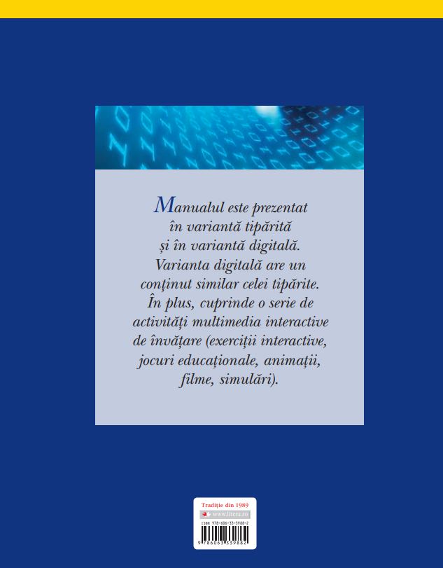 Manualul de Informatica si TIC cuprinde patru unitati de invatare care respecta domeniile si continuturile din programa. Lectiile sunt insotite de activitati de invatare-evaluare interactive, cu caracter practic-aplicativ, care determina formarea competentelor specifice cu care acestea sunt corelate.