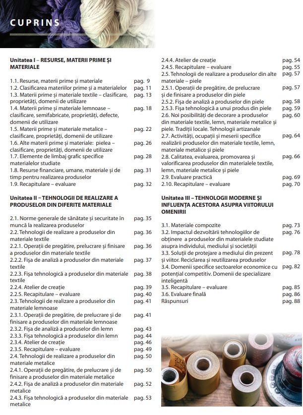 Manualul Educatie tehnologica si aplicatii practice respecta reglementarile din programa scolara nr. 3393 / 28. 02. 2017 aprobata de Ministerul Educatiei Nationale si este structurat pe 3 unitati de invatare: