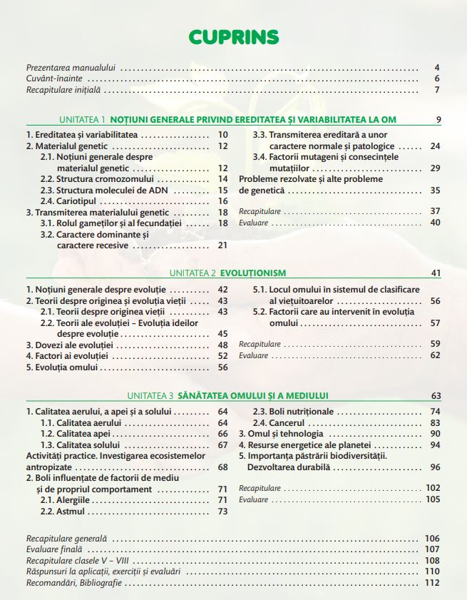 Manualul contribuie la formarea cunostintelor si competentelor specifice studiului lumii vii, asigurand texte accesibile si imagini clarificatoare pentru pentru intelegerea notiunilor de genetica umana, de evolutionism si de sanatatea omului si a mediului.