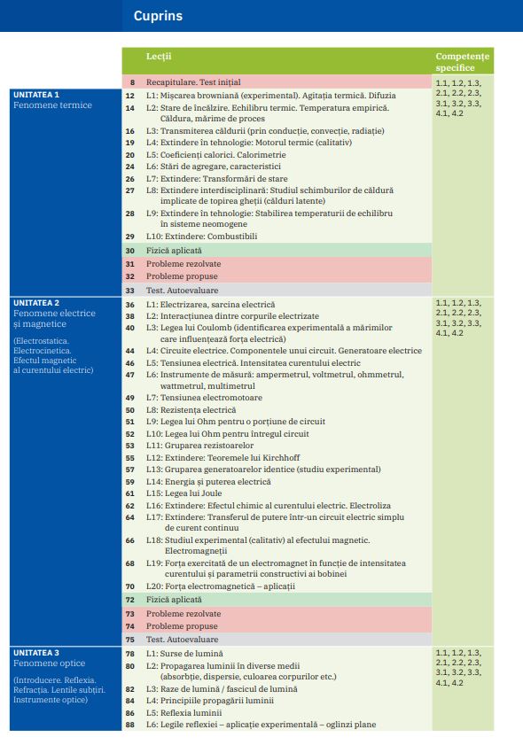 O caracteristica a manualului – foarte utila din punct de vedere didactic – este ca fiecare unitate de invatare este finalizata cu un numar de probleme, un test de evaluare si unul de autoevaluare. Aceste teste, numeroase si interesante, pot ajuta elevii in aprecierea propriei evolutii pe calea studiului fizicii.
