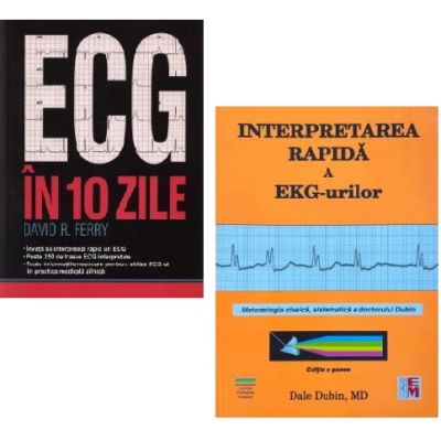 Pachetul contine titlurile Interpretarea rapida a EKG-urilor - Editia a sasea Dale Dubin Devenita deja clasica lucrarea este cel mai popular si cel mai citat manual de EKG. Timp de peste 37 de ani a ramas best seller-ul mondial din acest domeniu aparand in 46 de limbi. In prezent lucrarea este cea mai la zi dintre toate pentru ca este actualizata la fiecare retiparire. Bogat ilustrata color cartea asigura intelegerea rapida prin formatul simplificat si interactiv al expunerii. Fiecare capitol poate fi parcurs si asimilat in intregime intr-o singura si scurta sedinta de studiu. Pe parcursul invatarii modului in care se interpreteaza EKG-urile cititorul dobandeste intelegerea mai profunda a fiziologiei cordului. Intrucat autorul pune accentul pe intelegere si nu pe memorare se obtin rapid cunostinte practice de EKG utile toata viata. Cuprins Principii de baza. Cum se inregistreaza EKG. Sistemul nervos autonom. Rata. Ritmul partea I aritmiile focale. Ritmul partea II blocurile. Axul. Hipertrofia. Infarctul include Hemiblocurile . Diverse. ECG-UL in 10 zile - David R. Ferry Electrocardiografia este o explorare cardiaca neinvaziva extrem de importanta care se poate efectua in orice conditii si care ofera informatii foarte utile pentru strategia terapeutica ulterioara. Avand in vedere importanta diagnostica vitala a electrocardiogramei ea trebuie inteleasa si insusita de toti medicii indiferent de specialitate de medicii rezidenti de studentii la me-dicina si de alti profesionisti din domeniul medical. ECG in 10 zile are la baza cursul foarte popular al autorului si ofera o abordare pas cu pas unica imagini vectoriale extrem de clare plus trasee ECG de exercitiu pentru a creste increderea in sine si a rafina abilitatile clinice. In paginile acestei lucrari veti gasi informatii esentiale privind anomaliile de conducere sino-atriala si atrio-ventriculara ischemia si infarctul miocardic aritmiile prin reintrare si cele ectopice sindroamele de pre-excitatie tahicardiile cu complexe QRS largi si pacemakerele electronice. La sfarsitul cartii sunt prezentate 100 de electrocardiograme erse cu interpretare.