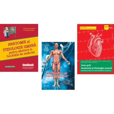 1. Anatomie si fiziologie pentru admitere la facultatile de medicina. Editia 2022 Barron s - Barbara Krumhardt ed. University Press Coordonatorul editiei in limba romana Prof. Dr. Angela Borda Adaptarea si verificarea textului in limba romana Angela Borda Cristina Branea Oana Capraru Constantin Enciulescu Cosmin Moldovan Adela Nechifor-Boila Alin Nechifor-Boila Traducatori Anca Bacarea Mihai Gliga Kutasi Reka Cosmin Moldovan Mircea Muresan Simona Muresan Anca Rachita Tehnoredactare Valentin Nadasan Un manual pentru invatarea sistematica si usoara a anatomiei si fiziologiei O prezentare detaliata a structurii si functiilor corpului uman Fiecare sistem al organismului este abordat intr-un capitol separat Grafice diagrame si ilustratii instructive Admiterea la o facultate de medicina este dificila. Reusita presupune perseverenta si mobilizare in stradania de a memora notiuni vaste si adesea abstracte. Tocmai de aceea materialele trebuie concepute in asa fel incat sa le permita candidatilor intelegerea unor fenomene biologice favorizand capacitatea de a integra informatii din domenii diferite conexe cu anatomia si fiziologia - chimia fizica genetica acestea impreuna fiind indispensabile asimilarii materiilor de studiu din primii ani de facultate. Rigorile unui bun manual utilizat pentru admitere impun transmiterea informatiilor in forma unor notiuni clar definite prezentate intr-un stil unitar bine sistematizat cu pastrarea unui echilibru intre esential si detaliu si nu in ultimul rand pretabil la alcatuirea de intrebari. Anatomie fiziologie umana pentru admitere la facultatile de medicina scrisa de Barron s indeplineste aceste cerinte cartea nefiind doar o simpla traducere din limba engleza a unui manual utilizat in pregatirea candidatilor pentru facultatile si colegiile din SUA ci si o adaptare a textului la terminologia utilizata in predarea biologiei umane la nivel de studii liceale. Cartea Anatomie si fiziologie umana Barron s pentru admitere la facultatile de medicina o gasiti in sectiunea Medicina Carti de specialitate mai exact Medicina Generala si a fost publicata la Editura UNIVERSITY PRESS UMF . Anatomie si fiziologie pentru admitere la facultatile de medicina Barron s este un manual pentru invatarea sistematica si usoara a anatomiei si fiziologiei. Acesta contine o prezentare detaliata a structurii si functiilor corpului uman fiecare sistem al organismului este abordat intr-un capitol separat grafice diagrame si ilustratii instructive. Avand o structura bine-organizata clara si complexa aceasta este foarte apreciata pentru bogatia de informatii care servesc cunoasterii de la scara macroscopica pana la celula molecula si atom. Cartea lui Barron s admitere medicina este considerate in egala masura utila si elevilor care invata biologia dar si profesorilor care predau aceasta disciplina. Totodata cartea aceasta este un pretios instrument de lucru pentru candidati. Prin intermediul cartii lui Barron s acestia reusind sa se familiarizeze cu procedurile de admitere utilizate la facultatile de medicina din tara deoarece fiecare capitol contine un numar de 100 de intrebari de tipuri diferite completare de notiuni care se gasesc in textul capitolului intrebari cu raspuns la alegere intrebari de tip adevarat fals dar si un studiu de caz. Prin urmare daca iti doresti sa ai la indemana cele mai bune resurse pentru ca sa te pregatesti in vederea sustinerii unui examen la medicina nu evita si comanda aceasta carte a lui Barron s. 2. Anatomia si fiziologia omului. Teste grila pentru admiterea la facultatile de medicina dupa manualul Barron s - Lorela Caradan ed. Taida Aparitia acestei culegeri de teste era imperios necesara pentru toti cei dornici sa se afirme in domeniul biologiei si pentru admiterea in invatamantul superior medicina generala medicina dentara kinetoterapie etc. avand ca sursa bibliografica manualul BARRON S. Aceasta lucrare prin continutul sau ofera un sprijin candidatilor la facultatile de medicina prin accesibilizarea informatiilor fixarea si consolidarea cunostintelor dezvoltarea gandirii critice a intuitiei si a abilitatii de a corela notiuni din diferite capitole asigurand perceperea organismului ca unitate structurala si functionala dar si formarea unui bagaj minim de cunostinte necesare viitorului student. Volumul ofera un numar de 1400 de teste de tip complement simplu sistematizate pe 22 capitole si este un excelent instrument de lucru pentru ca stimuleaza invatarea logica asigurand verificarea ritmica a cunostintelor acumulate oferind si posibilitatea unei evaluari finale sumative prin parcurgerea testelor recapitulative. Cele cinci teste sumative de la finalul lucrarii reprezinta pentru aspirantii medicinisti un reper pentru aprecierea capacitatii de sinteza a informatiilor dobandite pe parcursul invatarii printr-o gandire fluida si flexibila. Cu speranta ca aceasta lucrare va fi un instrument util si eficient in intelegerea anatomiei si fiziologiei organismului uman uram succes tuturor candidatilor la examenele de admitere la medicina. CUPRINS 1. Introducere in anatomie si fiziologie 2. Celulele si fiziologia celulara 3. Oasele si articulatiile 4. Tesutul muscular 5. Tesutul nervos 6. Organizarea sistemului nervos 7. Organele de simt 8. Sistemul endocrin 9. Sangele 10. Sistemul cardiovascular 11. Sistemul limfatic 12. Sistemul respirator 13. Sistemul digestiv 14. Metabolism si nutritie 15. Sistemul urinar 16. Sistemul reproducator masculin 17. Sistemul reproducator feminin 18. Test recapitulativ nr. 1 19. Test recapitulativ nr. 2 20. Test recapitulativ nr. 3 21. Test recapitulativ nr. 4 22. Test recapitulativ nr. 5 Raspunsuri 3. Teste-grila de Biologie pentru Admiterea 2023 la universitatile de medicina dupa manualul Barron s. Anatomie si fiziologie umana - Alexandru Mihai Antohi Alexandru Croitoru ed. Art Klett Teste-grila de biologie pentru Admiterea 2023 la universitatile de medicina dupa manualul Barron s Anatomie si fiziologie umana. Lucrarea Teste-grila de an
