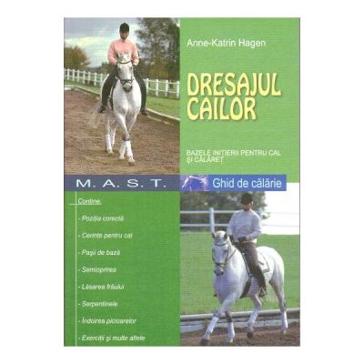 Dresajul cailor, bazele initierii pentru cal si calaret de Anne-Katrin Hagen Ghid de calarie Acest ghid de calarie contine informatii despre: pozitia corecta, cerinte pentru cal, pasii de baza, semioprirea, lasarea fraului, serpentinele, indoirea picioarelor, exercitii si multe altele. Editura M. A. S. T.Specificatii