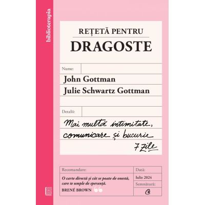 Bazandu-se pe decenii de cercetare si analiza a relatiilor de cuplu John si Julie Gottman aduna in Reteta pentru dragoste cele mai puternice ingrediente menite sa va consolideze relatia. De-a lungul a sapte zile veti invata sa va dozati eficient grija si afectiunea si sa renuntati la tot ce dauneaza sanatatii cuplului critica dispretul atitudinea defensiva si refuzul comunicarii. Informatiile rezultate din experienta indelungata a autorilor exemplele relevante si sfaturile usor de pus in practica fac din aceasta carte un ghid extrem de util la indemana tuturor cuplurilor care simt ca au ratat o etapa din cladirea relatiei lor. Avand la baza o solida cercetare stiintifica reteta iubirii propusa de sotii Gottman explica pas cu pas care sunt ingredientele necesare si pasii indispensabili pentru dezvoltarea unei relatii de durata.Specificatii