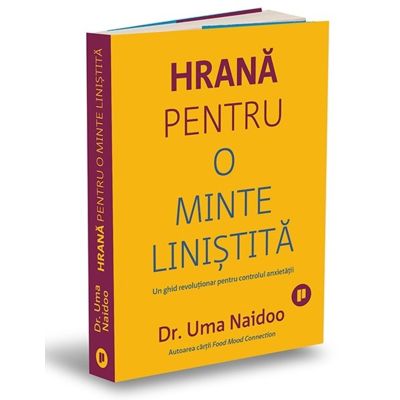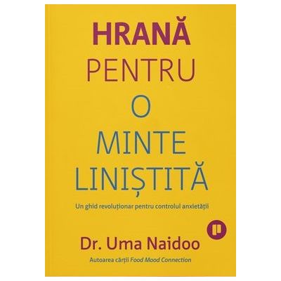 Pornind de la cele mai recente descoperiri stiintifice cu privire la legaturile dintre dieta si anxietate Uma Naidoo ne arata cum sa folosim eficient hrana si nutritia ca instrumente esentiale pentru o minte linistita. In aceasta carte veti afla despre efectul inflamatiei asupra multor aspecte de la anxietate la depresie si la boala Alzheimer trilioanele de bacterii care traiesc in intestinul tau si care sunt esentiale pentru controlarea anxietatii cele sase principii pentru linistirea mintii alimentele care trebuie consumate pentru echilibrarea leptinei o legatura esentiala dintre sistemul tau nervos central si procesele metabolice importanta introducerii in dieta a alimentelor care alina anxietatea de la cele obscure ashwagandha la cele omniprezente vitamina C cele mai bune diete pentru gestionarea problemelor de anxietate si depresie. Pe langa recomandari pentru crearea propriului plan alimentar pentru combaterea anxietatii si zeci de retete delicioase pline de nutrimente Hrana pentru o minte linistita va va ajuta sa va stimulati imunitatea sa reduceti nivelul de anxietate si sa va cresteti nivelul bunastarii mintale. Dupa ce citesti explicatiile usor de inteles si bazate pe studii stiintifice ale Umei Naidoo despre legatura dintre nutritie si sanatatea mintala iti schimbi definitiv alegerile alimentare. In aceasta carte revolutionara autoarea ne invata cum sa folosim alimentele pentru a domoli simptomele de anxietate si pentru a ne linisti mintea. Dr. Mark Hyman autorul cartii Young Forever Aceasta carte uimitoare este exemplificarea felului in care alimentatia corecta poate calma anxietatea oferind o perspectiva noua in lumea noastra stresata. O lectura esentiala pentru cei care cauta alinare si liniste cu ajutorul alimentelor hranitoare care actioneaza ca mangaiere. Dr. David Perlmutter autorul cartilor Grain Brain si Drop Acid Cand vine vorba despre psihiatrie dr. Uma Naidoo este un lider unic la nivel global. In aceasta carte uimitoare abordeaza afectiunea cea mai prezenta acum in lume anxietatea. Cartea aceasta iti va modifica modul in care te raportezi la hrana pe care o mananci pentru a-ti linisti mintea. Dr. Daniel Amen autorul cartii Change Your Brain Change Your Life Psihiatria nutritionala e o disciplina noua iar dr. Uma Naidoo este lider global in acest domeniu. Aceasta carte este de neratat de catre oricine sufera de stres si anxietate in fond fiecare dintre noi Deepak Chopra Naidoo echilibreaza perfect studiile stiintifice recente si sfaturile practice oferind o multime de idei bune de implementat in timp ce recunoaste si importanta flexibilitatii. Este o abordare riguroasa dar accesibila privind modul in care cititorii pot manca mai bine pentru a se simti mai bine. Publishers Weekly O carte excelenta care abordeaza sanatatea mintala prin dieta. Ceva ce putem folosi cu totii pentru a ne imbunatati vietile Tom Brady Dr. Uma Naidoo este psihiatru nutritionist cu diploma la Harvard chef profesionist si biolog nutritional. De asemenea este fondatoarea si directoarea primului si singurului Serviciu de Psihiatrie Nutritionala si Metabolica din Statele Unite la Massachusetts General Hospital MGH . Este director de psihiatrie nutritionala la MGH Academy o organizatie educationala cunoscuta in lumea intreaga pentru care a elaborat si a lansat singurul program educational de psihiatrie nutritionala pentru clinicieni. Dr. Naidoo face parte din corpul profesoral al Harvard Medical School The Harvard Department of Nutrition si este instructor la The Cambridge School of Culinary Arts. Este autoarea bestsellerului Food Mood ConnectionSpecificatii