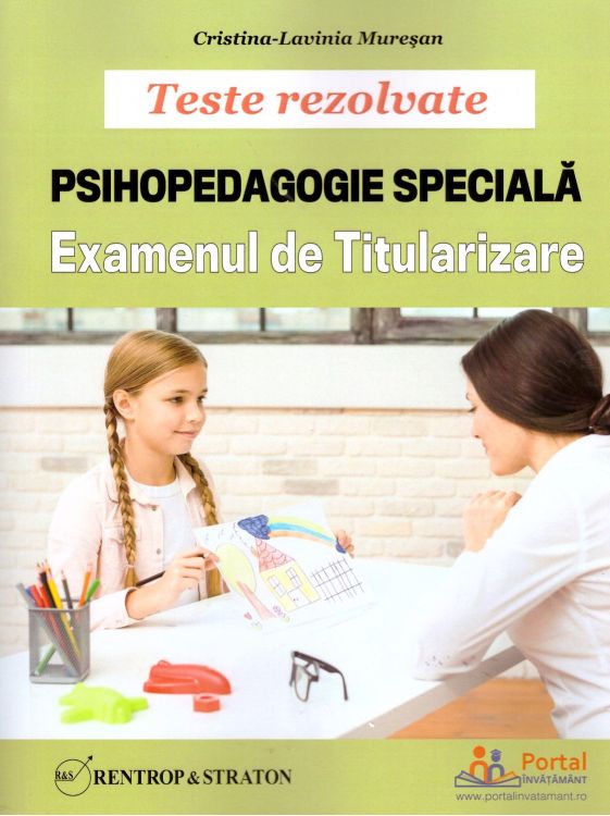 Formatul testelor Sunt alcatuite conform modelului elaborat de elaborat de Ministerul Educatiei Nationale - Centrul National de Evaluare si Examinare in conformitate cu programa specifica pentru examenul in vigoare. Fiecare test cuprinde 3 subiecte de specialitate avand fiecare o pondere de 30 de puncte. Noutatea este includerea in lucrare a rezolvarilor subiectelor insotite de explicatii ample si edificatoare pentru retinerea usoara a notiunilor bazata pe intelegere logica si nu pe memorare mecanica. Rezolvarile testelor sunt integrale si spre deosebire de lucrarile de teste similare de pe piata sunt insotite de explicatii complete si amanuntite numeroase exemple extrem de utile aprofundarii materiei comentarii argumentari si justificari. Cele 15 teste care alcatuiesc prezenta lucrare ating dezvolta si explica subiecte precum I. Obiectul si problematica psihopedagogiei speciale II. Etiologia specifica si clasificarea diferitelor tipuri de dizabilitati III. Factorii si etapele dezvoltarii copiilor tinerilor cu dizabilitati IV. Evaluarea psihopedagogica complexa si diagnosticarea copiilor tinerilor cu cerinte educative speciale V. Particularitatile dezvoltarii psihofizice si sociale ale copiilor tinerilor cu dizabilitati VI. Tulburarile de limbaj. Tulburarile de invatare VII. Specificul activitatilor educational-terapeutice in psihopedagogia speciala si a interventiilor psihopedagogice 1. Stimularea cognitiva 2. Ludoterapia 3. Terapia ocupationala 4. Formarea autonomiei personale si sociale VIII. Psihopedagogia integrarii incluziunii elevilor cu CES in scoala de masa IX. Formarea si dezvoltarea abilitatilor deprinderilor si capacitatilor in vederea integrarii socio-profesionale a copiilor tinerilor cu CES toate cerute de programa ministerului de resort.Specificatii