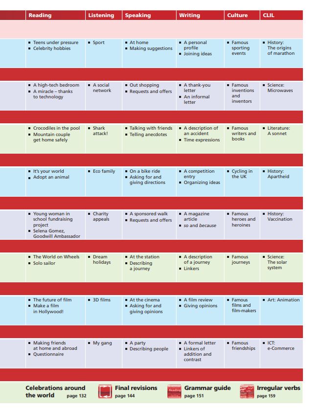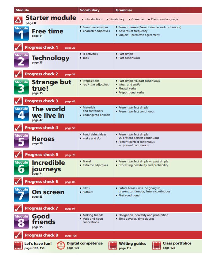 De asemenea, manualul mai cuprinde pagini cu: proiecte de grup, competente digitale, ghiduri de scriere, sarbatori din toata lumea, notiuni de gramatica, recapitulari finale, verbe neregulate.