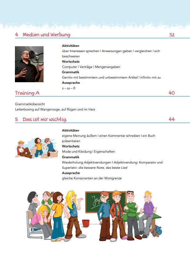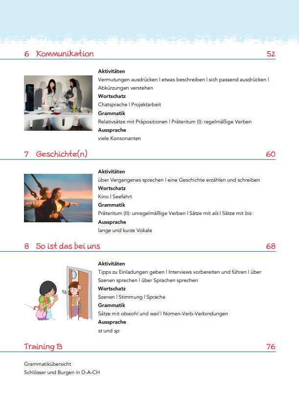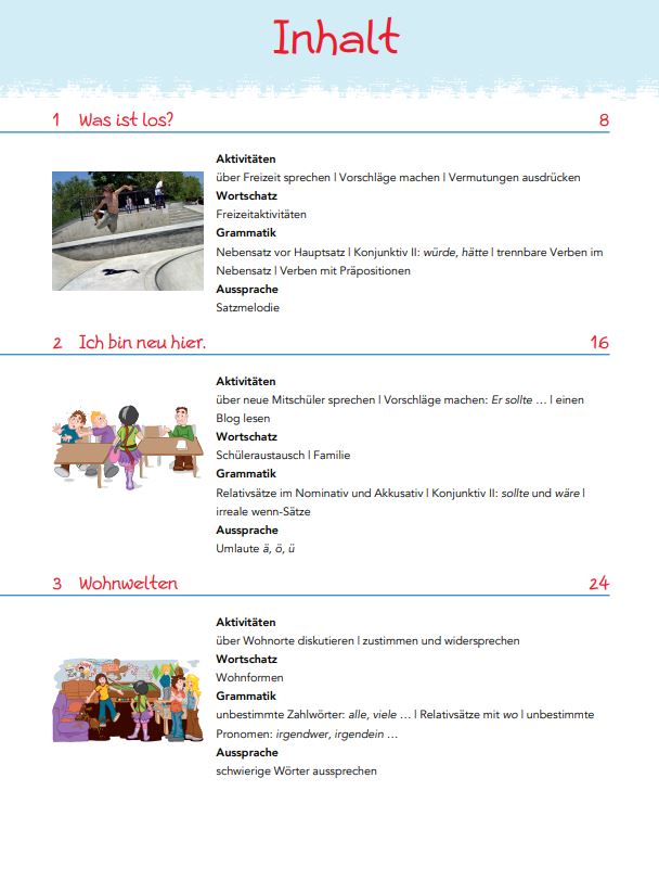 In partea introductiva a manualului avem o legenda destinata utilizatorului (Benutzerhandbuch, pag. 3), apoi un cuprins al celor 8 unitati (Inhalt, la pag. 4-6) urmat de enumerarea bilingva a competentelor generale si a celor specifice, toate fiind utile profesorului la intocmirea si sistematizarea planurilor de lectie.