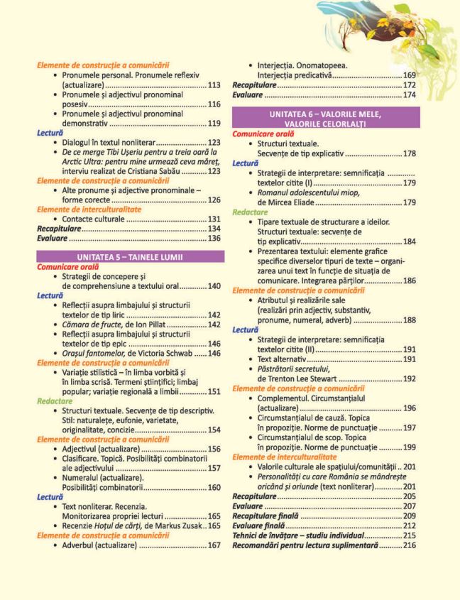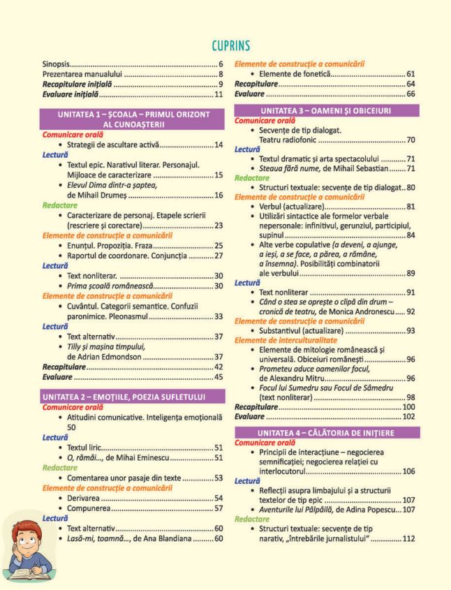 Iin cele sase unitati de invatare corespunzatoare subtemelor: Scoala – primul orizont al cunoasterii, Emotiile, poezia sufletului, Oameni si obiceiuri, Calatoria de initiere, Tainele lumii, Valorile mele, valorile celorlalti, domeniile de continut (comunicare orala, lectura, redactare, elemente de constructie a comunicarii, elemente de interculturalitate) sunt abordate integrat, oferindu-se modalitati variate de interpretare de text, de valorificare a fenomenului lingvistic in contexte multiple de comunicare.