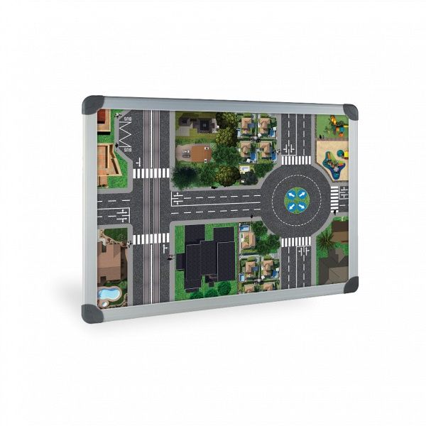 Macheta stradala magnetica de 60 x 90 cm perfecta pentru sala de legislatie. Se livreaza cu rama si suport de prindere pe perete. Se poate folosi atat orizontal cat si vertical. Desenul machetei include indicatoarele rutiere semnele de prioritate cedare de trecere stop etc. precum si masinute magnetice. Grafica plansei este de calitate superioara full-color reproducand realist situatii de trafic cotidiene.Specificatii