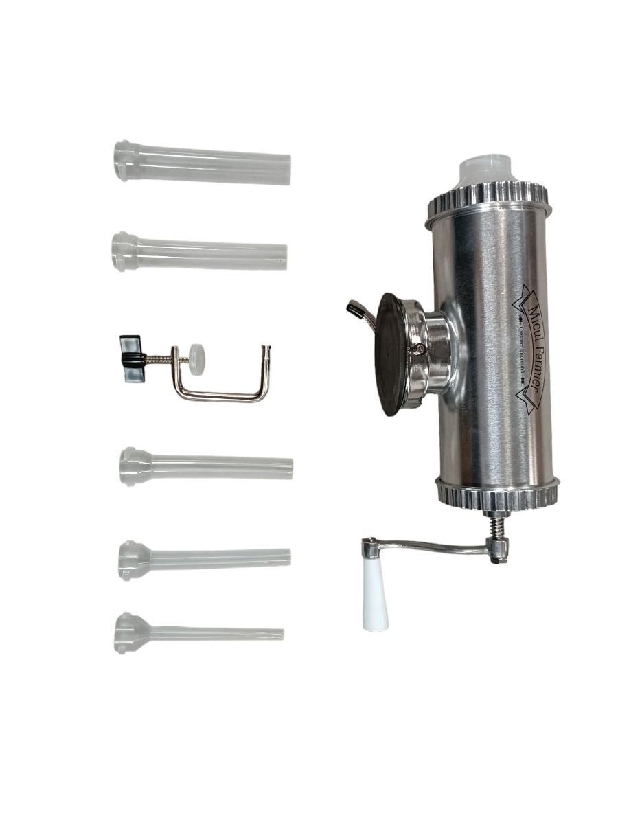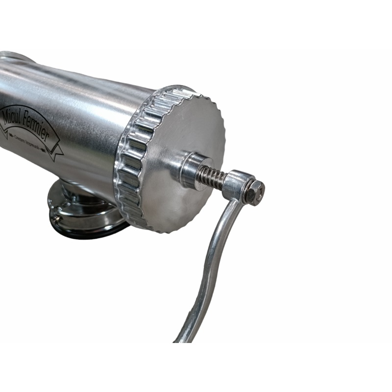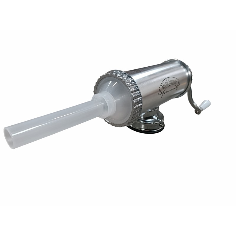 Masina de carnati 1.5kg AL ventuza 5 palnii, Micul Fermier GF-0824-S001-G02 Acum traditionalii si deliciosii carnati pot fi facuti oricand la dumneavoastra in bucatarie. Puteti prepara carnati de casa cu aparatul de capacitate maxima 1.5 kg dupa propria dumneavoastra reteta. Aparatul de carnati va ofera posbilitatea sa preparati carnatii intr-un timp foarte scurt. Aparatul este practic si foarte usor de folosit. Acesta vine pe un suport cu ventuza si cu o clema de prindere. Specificatii tehnice masina de carnati cu ventuza., 1.5kg, aluminiu , Micul Fermier GF-0824-S001-G02: • prinderea se face in doua moduri: cu ventuza sau pe masa, cu filet; • este usor de folosit si curatat; • este confectionat din aluminiu inoxidabil; • are o capacitate de maxim 1.5kg. Pachetul contine: • aparatul pentru carnati, • manivela de filet atasabila, • accesoriu de prindere pe masa, • cheita pentru insurubat, • soclu pentru palnii, • 5 palnii de diferite dimensiuni. Masina de facut carnati are specificatiile de utilizare inscriptionate pe cutie, cat si un grafic cu componentele si rolul acestora.Specificatii