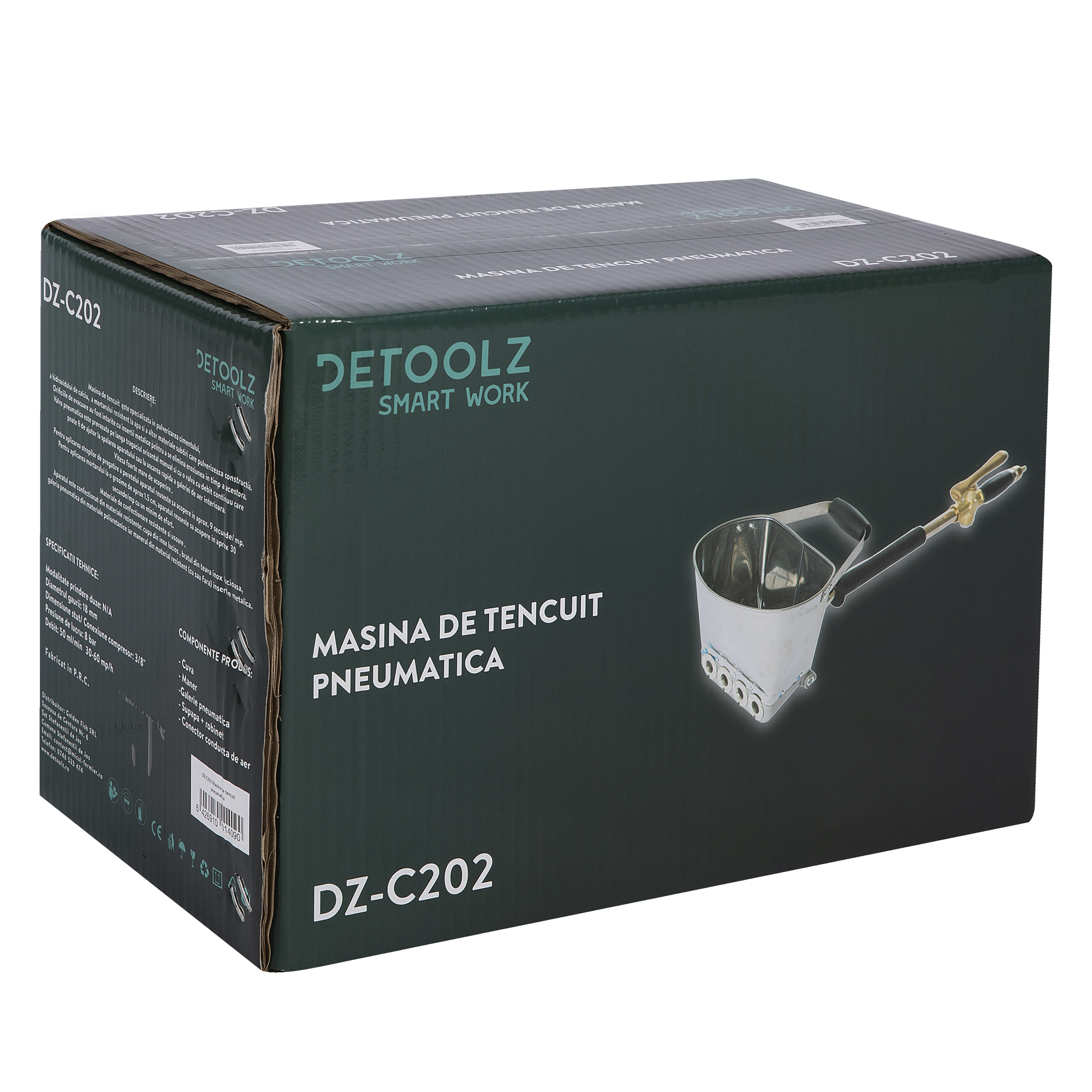 Masina de tencuit pneumatica, Detoolz DZ-C202 este foarte usor de utilizat in lucrarile de finisare a peretilor atat in interior, cat si exterior. Produsul nu include duze. Avantajele masinii de tencuit pneumatice: • Este simplu de montat/demontat si permite o curatare foarte usoara dupa utilizare; • Mareste eficienta si viteza de tencuire a peretilor; • Usor de operat de o singura persoana; • Este fabricata din otel inoxidabil. • Greutate redusa pentru confortul utilizatorului. Cum se utilizeaza masina de tencuit pneumatica DZ-C202: • In principiu se poate folosi orice tip de mortar pe baza de ciment, apa, nisip, var, ipsos avand granulatie medie(2-5 mm); • Mixati mortarul dorit pana la omogenizarea acestuia. Nu este obligatoriu sa adaugati apa pentru a inmuia mortarul. Respectati reteta de mortar de pe sacul producatorului. • Clatiti masina intr-un recipient cu apa pentru a uda cupa acesteia si pentru a facilita alunecarea mortarului. Faceti acest lucru in mod repetat, odata la 10-12 incarcari pentru a clati cupa si pentru a se evita intarirea sau patrunderea mortarului in galerie. • Cand lucrati cu o singura duza pentru aplicarea stropilor (spritul care se da inaintea tencuielii) folositi pentru acest lucru un mortar normal sau putin diluat 5% cu apa. Masina nu este facuta sa functioneze cu ’’zeama de ciment’’. Presiunea aerului va reusi sa pulverizeze mortarul gros si sa il transforme in stropi foarte mici (bob de orez). Astfel mortarul pulverizat cu o duza va patrunde foarte puternic in porii caramizii / bca-ului si va forma un strat abraziv pe perete pentru o aderenta perfecta si durabila; • Dupa utilizare clatiti foarte bine masina sub jet de apa si nu doar prin inundarea acesteia si apasarea tragaciului. • Depozitati intotdeauna masina de tencuit pneumatica cu duzele in jos pentru a se scurge apa. Componenta masina de tencuit pneumatica, Detoolz DZ-C202: • Cuva; • Maner; • Galerie pneumatica; • Supapa + robinet; • Conector conducta de aer.