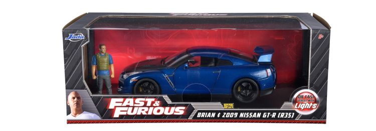 Masinuta din metal Nissan Skyline GT-R, cu usi, capota si portbagaj ce se pot deschide, scara 1: 18. Farurile sunt functionale iar setul include si o figurina din metal Brian Conner.