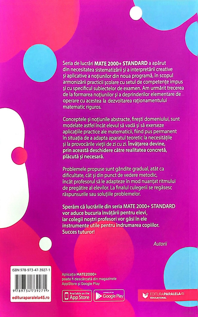 Speram ca lucrarile din seria MATE 2000+ STANDARD vor aduce bucuria invatarii pentru elevii carora se adreseaza, iar colegii nostri profesori vor gasi in ele instrumente utile pentru indrumarea copiilor. Succes tuturor!