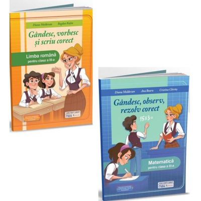 Set 2 caiete pentru clasa a 3-a Gandesc vorbesc si scriu corect. Limba romana si Gandesc observ rezolv corect. Matematica - Diana Moldovan