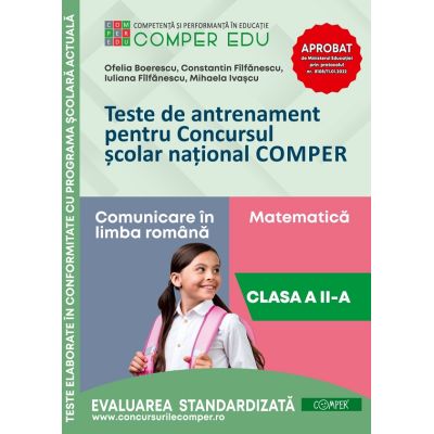 Lucrarea este destinata elevilor de clasa a II-a care se pregatesc suplimentar pentru sustinerea Concursului scolar national Comper la toate cele trei etape anuale etapa 1 modulul 1 si 2 etapa a II-a modulul 3 si 4 Etapa a III-a Olimpiada digitala Comper modulele 1 2 3 4 5 . la disciplinele LIMBA SI COMUNICARE IN LIMBA ROMANA si MATEMATICA SI EXPLORAREA MEDIULUI. Subiectele de concurs pentru Etapa I si Etapa a II-a contin un numar de 18 intrebari formulate in asa fel incat sa corespunda nivelului de programa corespunzator fiecarui modul pana la data concursului. Continutul acestor teste este structurat pe doua niveluri de invatare diferentiata si progresiva STANDARD 16 intrebari cu grad de dificultate mediu conform standardelor prevazute de programele scolare si EXCELENTA 2 intrebari cu grad de dificultate specific olimpiadelor scolare atat pentru sectiunea COMPER-MATEMATICA cat si pentru sectiunea COMPER-LIMBA SI COMUNICARE IN LIMBA ROMANA. Subiectul de concurs pentru Etapa nationala contine 18 intrebari si este structurat pe doua niveluri de invatare diferentiata si progresiva STANDARD 16 intrebari cu grad de dificultate mediu conform standardelor prevazute de programele scolare si EXCELENTA 2 intrebari cu grad de dificultate specific olimpiadelor scolare atat pentru sectiunea COMPER-MATEMATICA cat si pentru sectiunea COMPER-LIMBA SI COMUNICARE IN LIMBA ROMANA.Specificatii