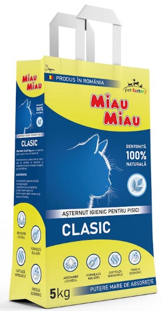 MIAU MIAU CLASIC 5kg este un asternut igienic pentru pisici, din bentonita. Miau Miau Clasic este un produs natural si steril (bentonita), realizat pentru a se solidifica la contactul cu umezeala in portiuni compacte, usor de inlaturat. Absenta umezelii si mirosurilor il face atragator pentru animalele domestice, in special pentru pisici. CARACTERISTICI: din bentonita conglomerata alba formeaza bulgari capteaza mirosurile neplacute produce foarte putin praf ofera un raport optim calitate-pret produs in Romania