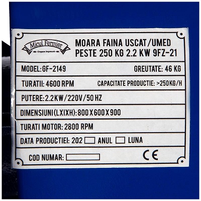 Moara de faina uscat/umed, capacitate de macinare 250kg, 2.2KW, 9FZ-21, Micul Fermier GF-2149 este un produs de uz gospodaresc pentru macinarea boabelor de cereale (grau, porumb, orz, secara, etc.), de oleaginoase (srot de floarea soarelui, soia, rapita, etc.), leguminoase(fasole, usturoi, cartofi uscati, etc.), sulfat de calciu dihidrat, peste uscat si amestecuri ale acestora, in scopul obtinerii de faina furajera necesara hranirii animalelor din micile ferme individuale.