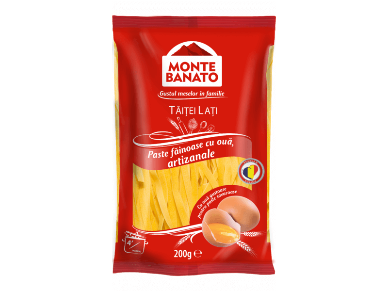 Pastele fainoase cu ou Monte Banato sunt fabricate din faina grifica si oua de calitate, iar textura rezultata influenteaza calitatea retetelor preparate de consumatorii nostri. Monte Banato este liderul pietei de paste fainoase cu ou din Romania (conform Nielsen Romania).