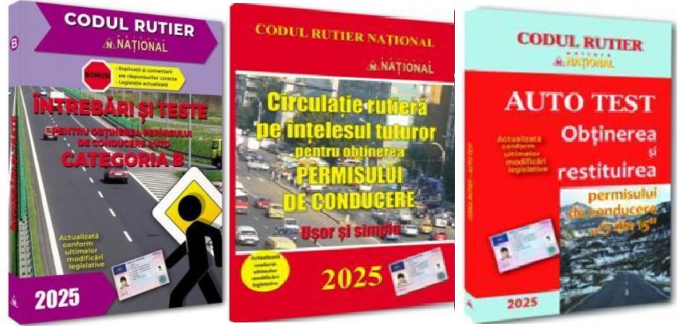 Noua editie 2025 – actualizata, revizuita si completata cu intrebari noi - a celui mai exhaustiv manual destinat sa faciliteze deprinderea si aprofundarea notiunilor elementare de circulatie rutiera in vederea obtinerii permisului de conducere categoria B - INTREBARI SI TESTE PENTRU OBTINEREA PERMISULUI DE CONDUCERE AUTO CATEGORIA B – ofera, de fapt, un pachet elementar de materiale specifice, care contine: o carte cu intrebari actualizate pentru verificarea cunostintelor de circulatie rutiera si o brosura care contine principalele legi ale codului rutier (Ordonanta de urgenta a Guvernului nr. 195/2002 privind circulatia pe drumurile publice, cu toate completarile la zi, si Regulamentul de aplicare a Ordonantei de urgenta nr. 195/2002), precum si explicatiile raspunsurilor corecte ale intrebarilor continute in carte.