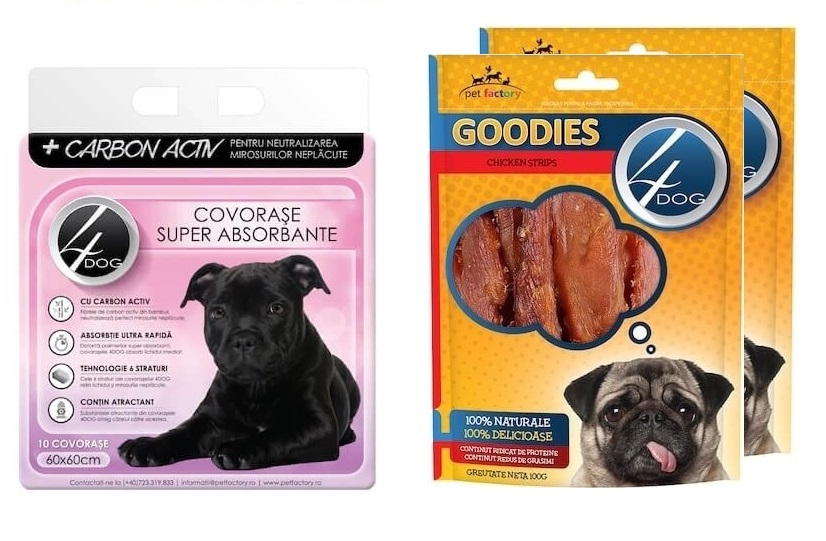 Pachet Covorase absorbante 60x60 charcoal 10 buc + Goodies chicken strips 100g x 2 buc, 4Dog