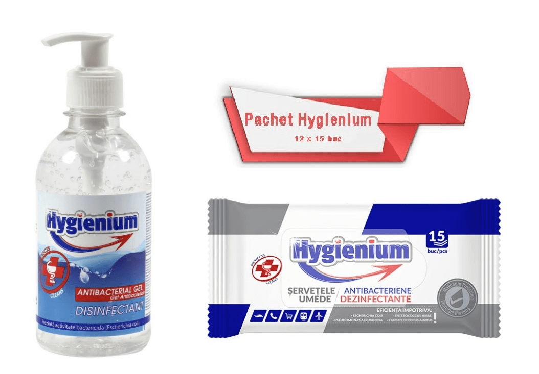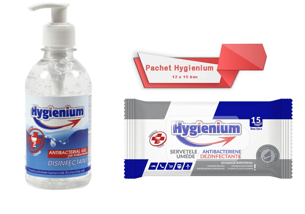 Pachet Hygienium: Gel dezinfectant pentru maini 300 ml + Pachet de Servetele umede antibacteriene 12x15 buc