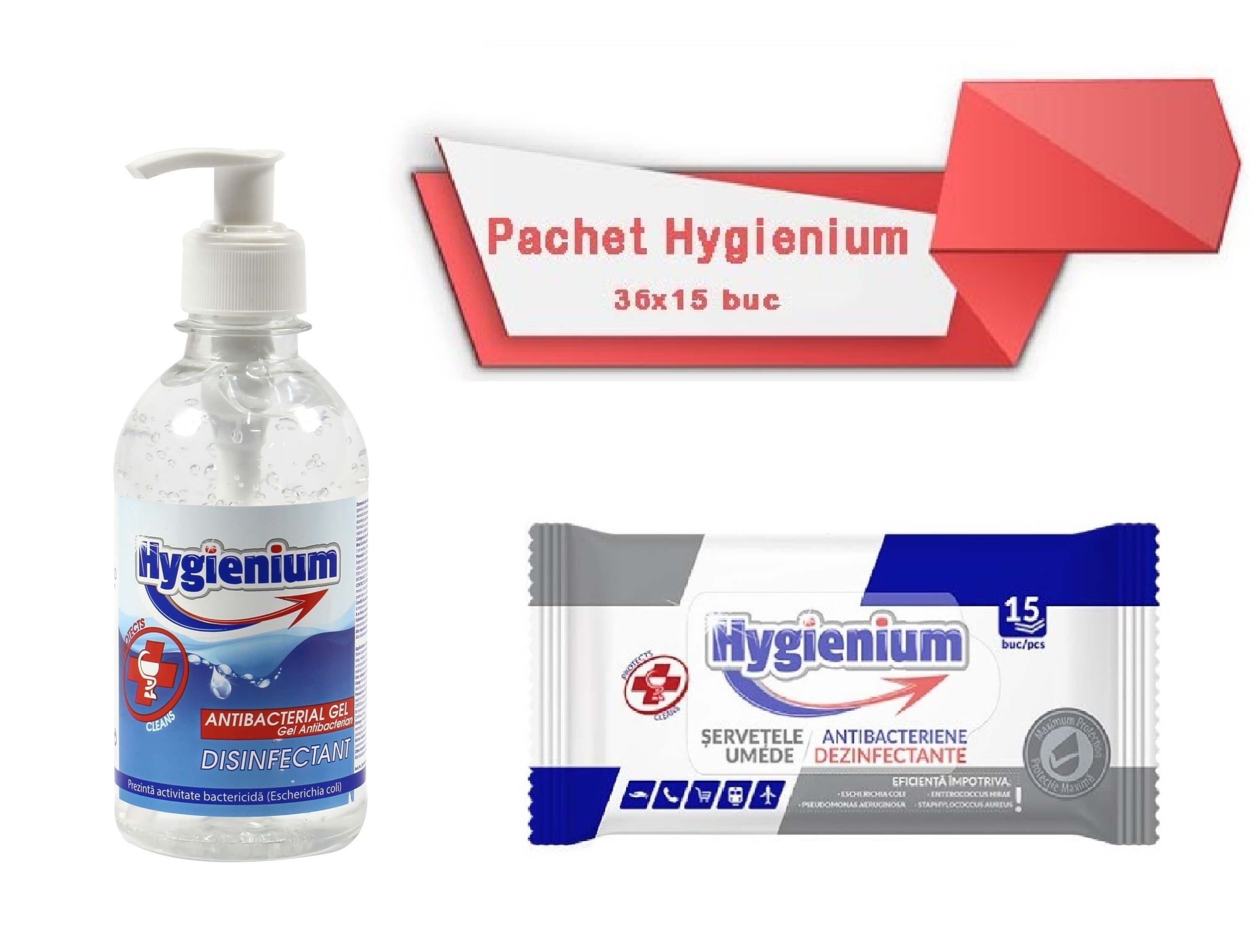 Pachet Hygienium: Gel dezinfectant pentru maini 300 ml + Pachet de Servetele umede antibacteriene 36x15 buc