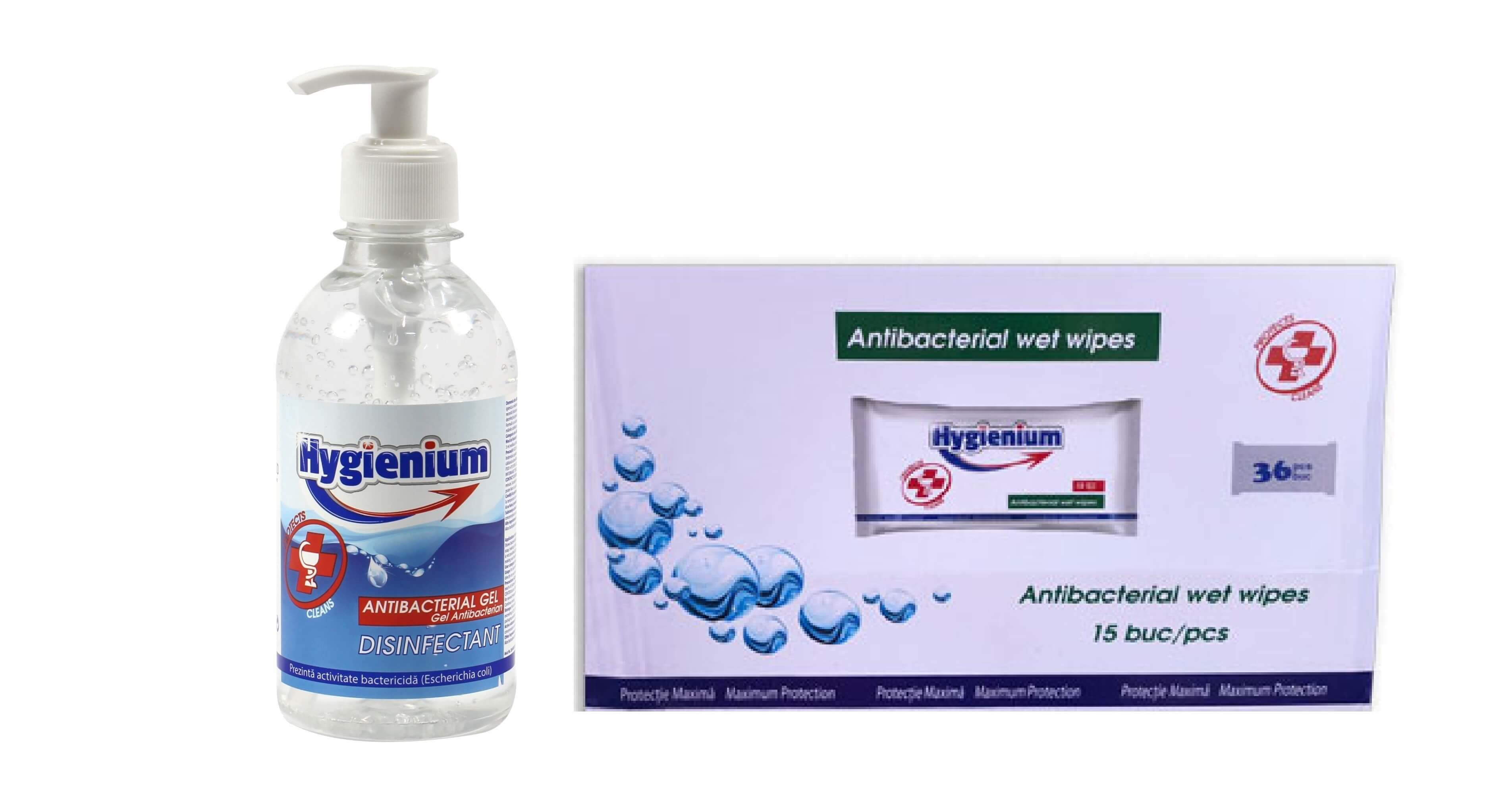 Pachet Hygienium: Gel dezinfectant pentru maini 300 ml + Servetele umede antibacteriene 36x15 buc