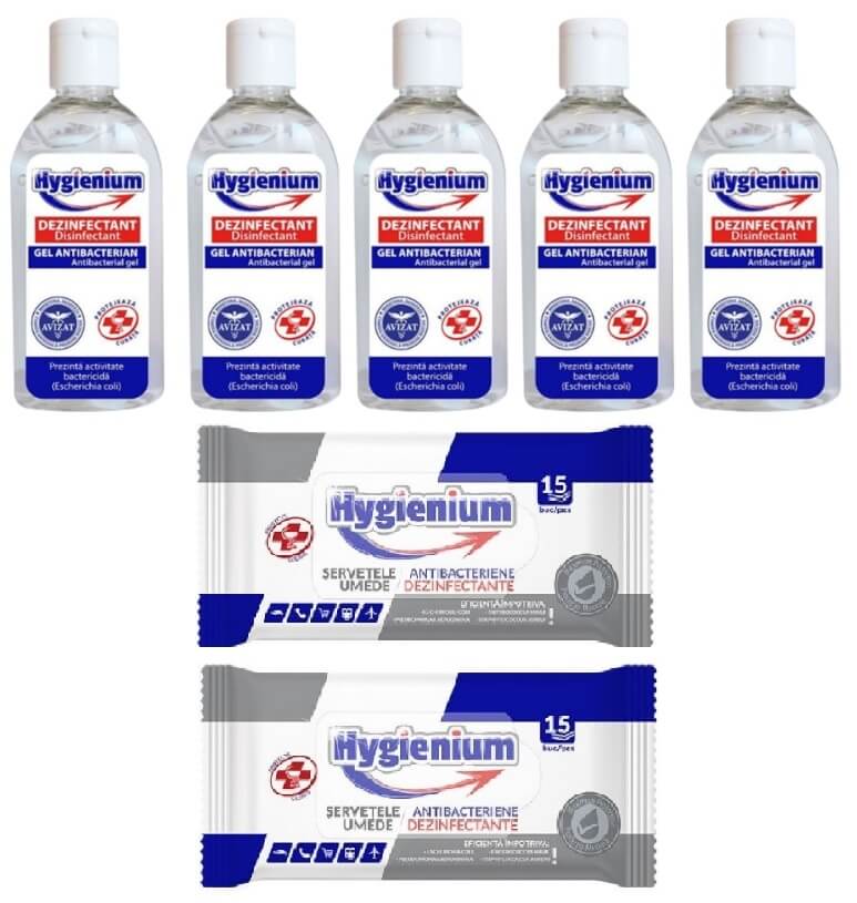 Pachet Hygienium Virucid: 5 x Gel dezinfectant maini 50 ml + 2 x Servetele umede dezinfectante 15 buc, avizat Ministerul Sanatatii