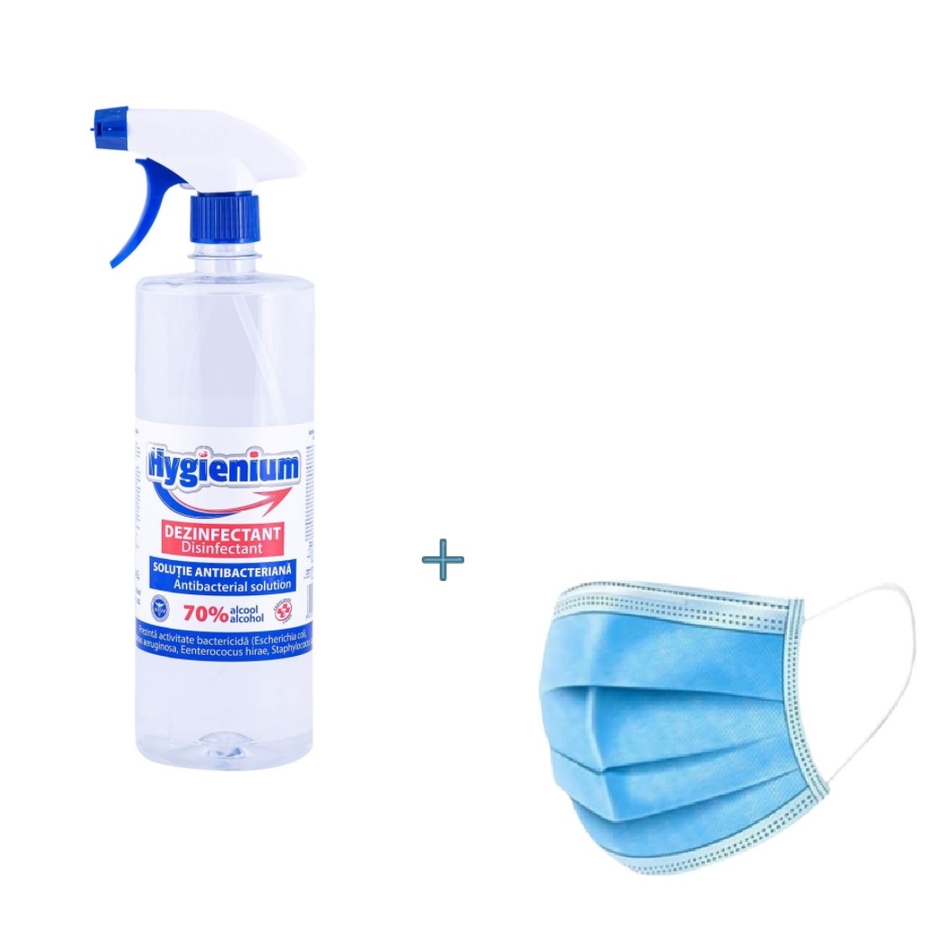Pachet Hygienium Virucid Dezinfectant maini 1L, avizat Ministerul Sanatatii + Masti de unica folosinta, 5 buc Hygienium TIP 2R gratis